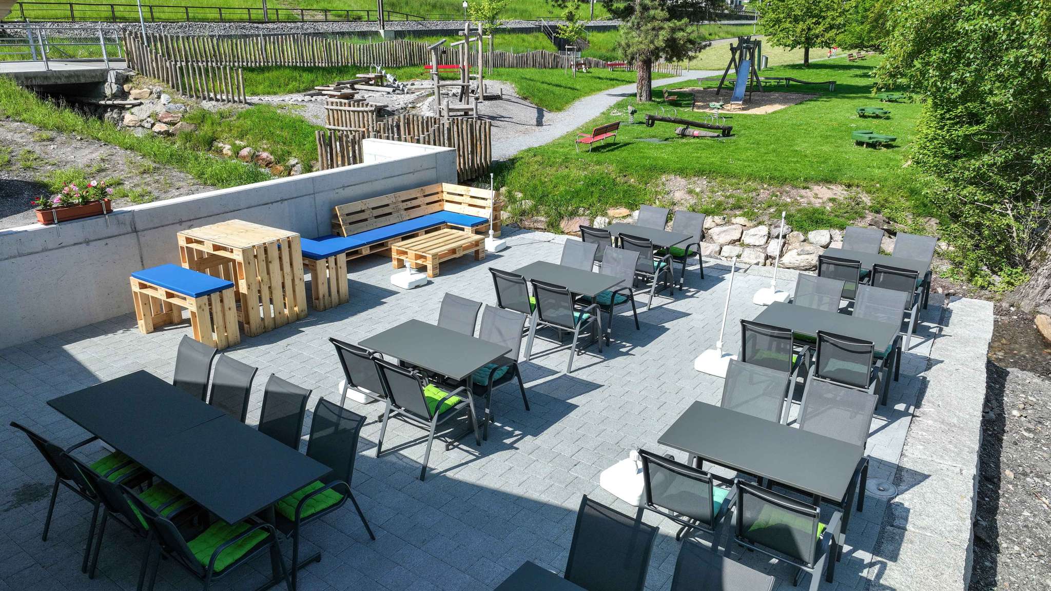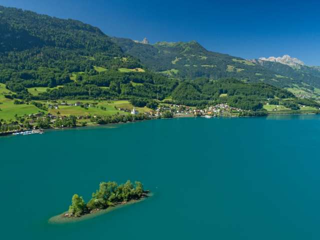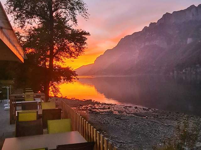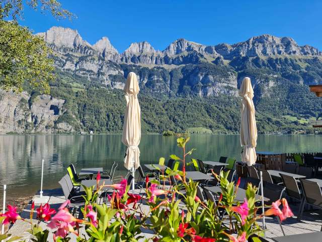 The bistro, which opened in May 2023, is located directly on the shores of Lake Walen. The unobstructed view of the lake and the Churfirsten peaks from the sun terrace is breathtaking.