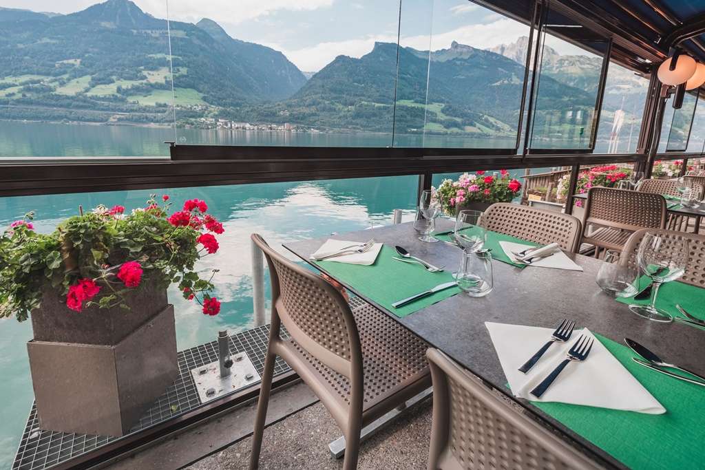 In summer it is undoubtedly best to enjoy a meal on the large lakeside terrace or under our plane tree. The lakeside terrace is weatherproof (all-weather blinds) and can also be heated if the weather permits. Enjoy the view of Lake Walen and the calming atmosphere of Quinten.