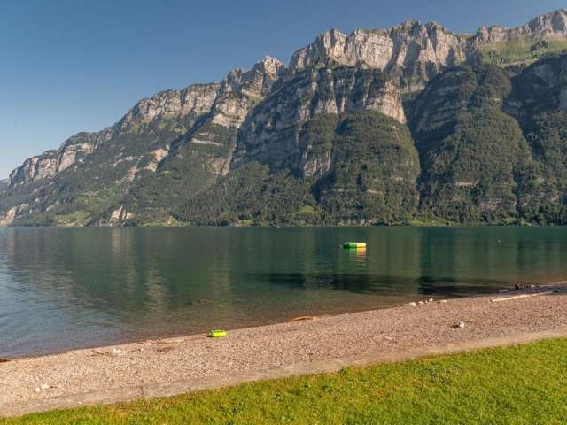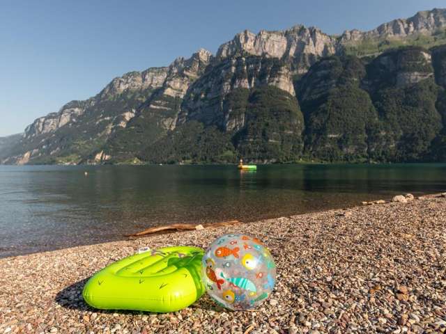 The Unterterzen lido on Lake Walen offers a spacious sunbathing lawn, a beach kiosk and a pebble beach. Water sports enthusiasts can hire kayaks or SUP boards. Changing rooms and toilets are available.
